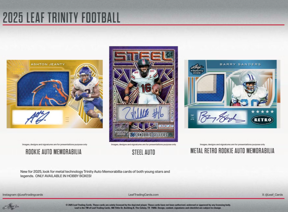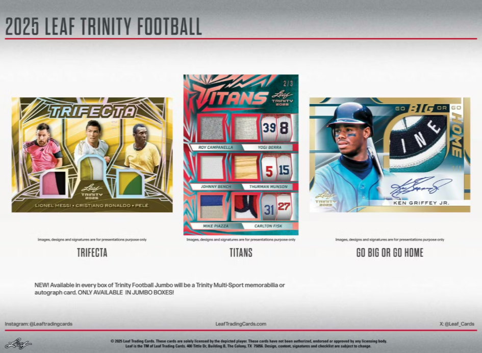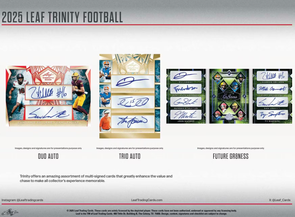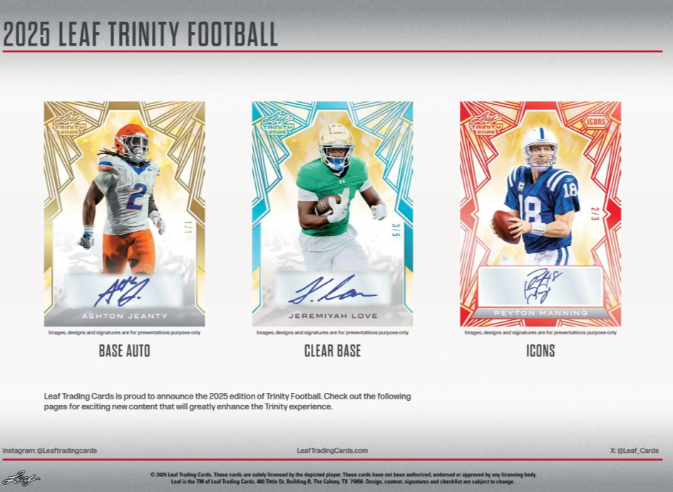 Leaf Trading Cards is proud to announce the 2025 edition of Trinity Football. Check out the following pages for exciting new content that will greatly enhance the Trinity experience.