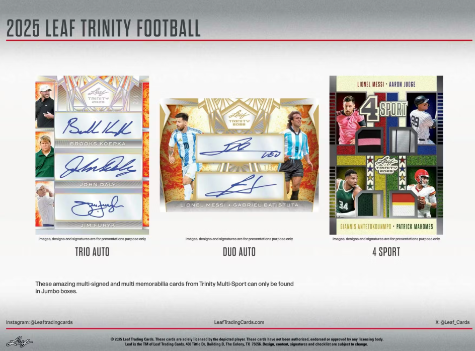 Look for JUMBO ONLY (1 per box) Trinity Multi-Sport Cards Featuring names like: Lionel Messi, Ken Griffey Jr., Giannis Antetokounmpo, and many more.