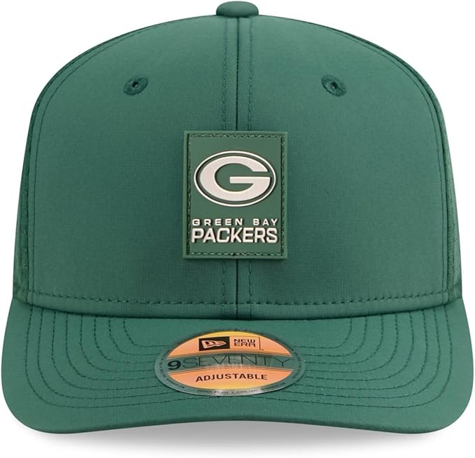 Gear up for the upcoming NFL season with the 2025 Sideline 9SEVENTY Adjustable Trucker Hat, the same headwear worn by Green Bay Packers players, coaches, and staff on the sideline. This 9SEVENTY trucker hat offers a modern, adjustable fit with its structured crown and semi-curved visor. COOLERA technology wicks away sweat to keep you cool, while MICROERA technology acts as an anti-microbial to reduce odor. The quick-dry cushion sweatband provides a soft, comfortable feel, perfect for those hot weather games. Featuring a sewn-down silicone Green Bay Packers patch on the crown, this hat is a stylish way to show your team pride.