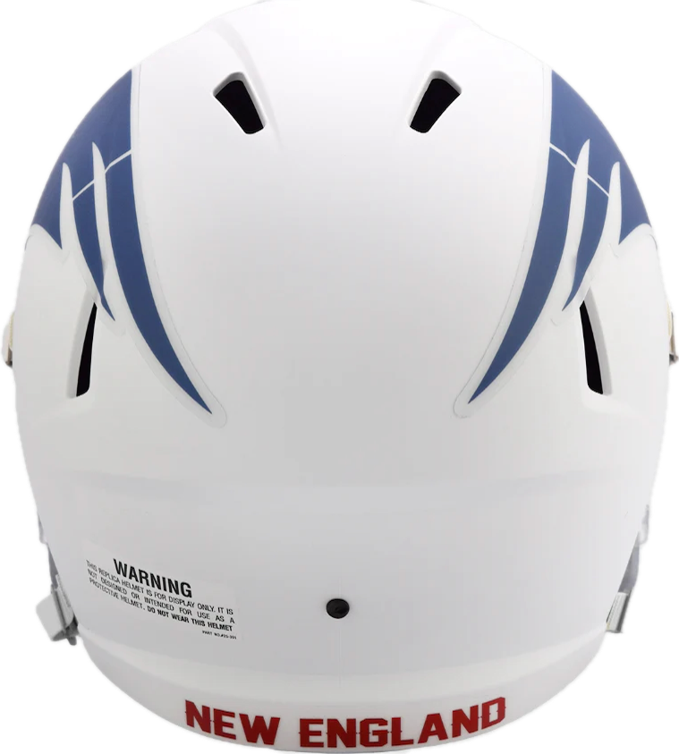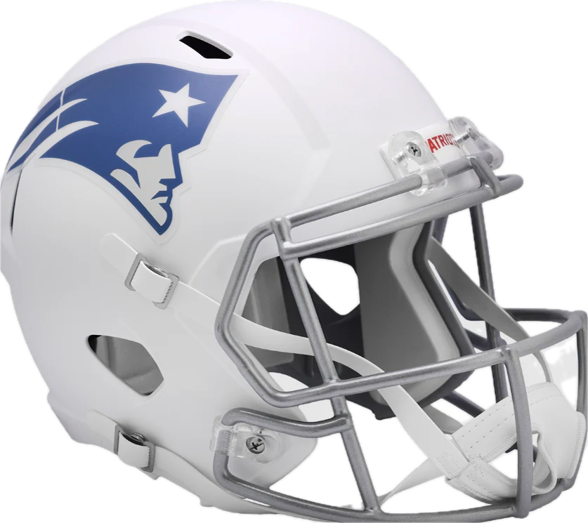 New England Patriots White 2025 Rivalries Full Size Speed Replica NFL Helmet by Riddell. This full size helmet is designed with a non-wear plate and molded foam jaw pads. a steel polyvinyl-coated face mask, 4-pt chin strap, and elliptical air vents. The officially licensed NFL helmet is great for autographs. The striking shape of the future. NFL Replica Speed helmet size medium measures: 12.75"(L), 9.25"(W), 9.75"(H). Full Size Speed Replica Helmet. (NOT FOR WEARING)