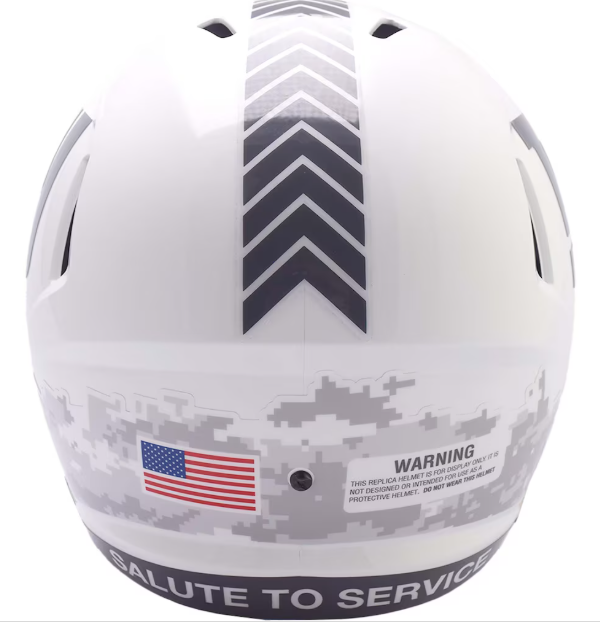 Honor our service members while supporting the Shield Merchandise with this 2024 Salute To Service Speed Replica Helmet. This Riddell collectible features a military-inspired color scheme, complete with an American flag and Salute To Service ribbon on the rear. The striking team graphics printed on the sides will add some much-needed spirit to your Shield Merchandise collection.