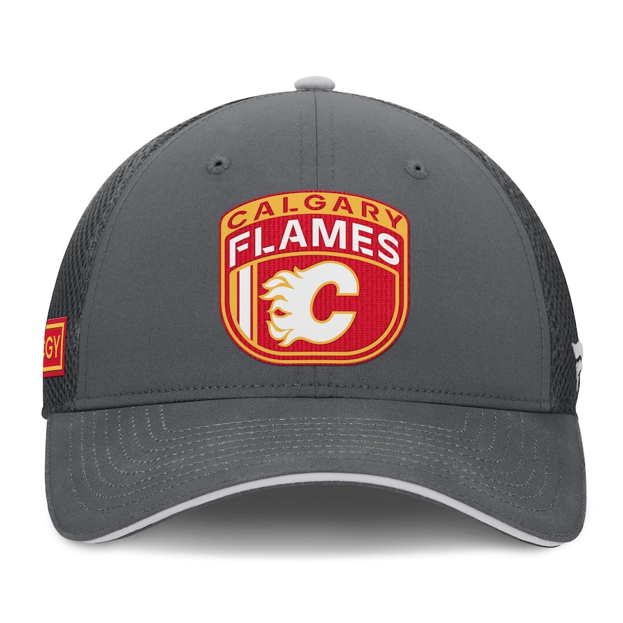 Get ready for game day with this Calgary Flames Authentic Pro Home Ice Trucker Adjustable Hat from Fanatics. As part of the Authentic Pro collection, it's built to mirror the same quality and style worn by the players and staff. With breathable mesh panels and a team patch on the front and side, this Calgary Flames hat is an ideal way to represent which squad you back on the ice.