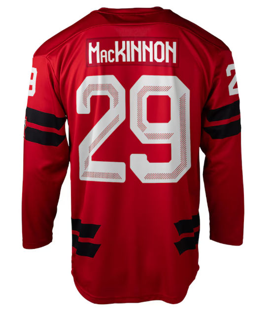 Get ready for the hunt of another Canadian gold medal with this Semi Pro Jersey. As one of the best players in the NHL today, Nathan MacKinnon is poised to lead Canada on the world stage. This jersey exudes the aura of Canada's storied hockey history with vibrant screen-printed graphics and an embroidered fabric applique. The mesh under-sleeve panel ensures ventilation, keeping you comfortable while you cheer on Team Canada.