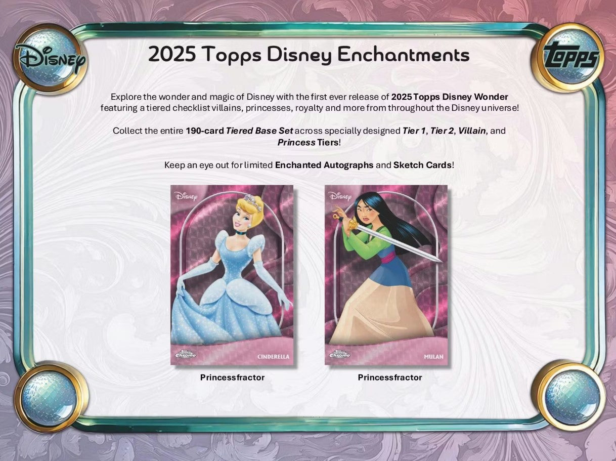 Explore the wonder and magic of Disney with the first ever release of 2025 Topps Disney Wonder featuring a tiered checklist villains, princesses, royalty and more from throughout the Disney universe!