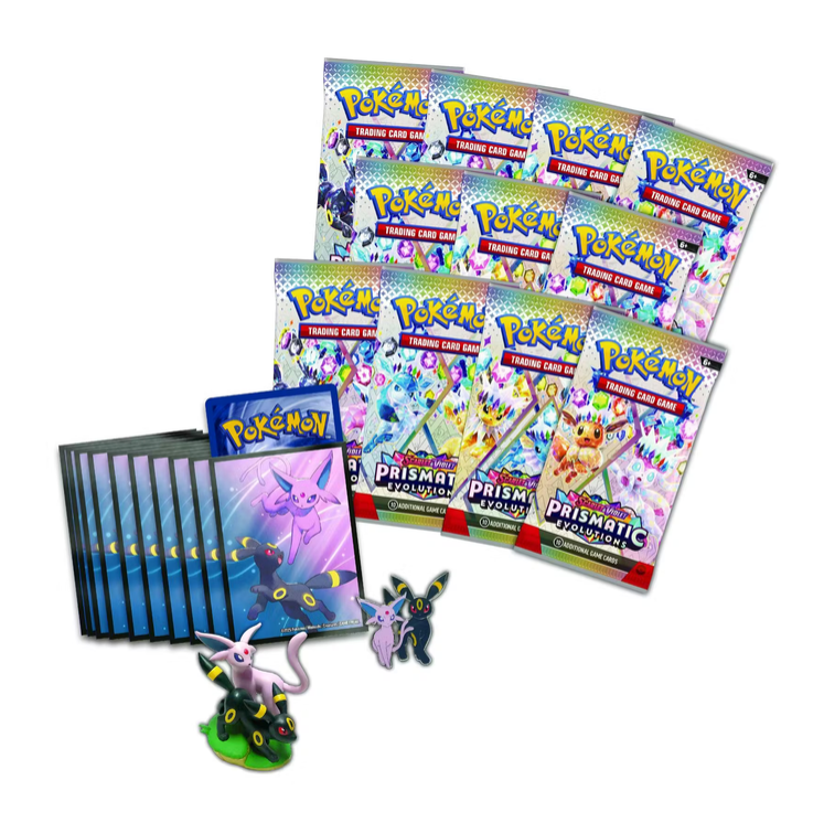 The Sun Pokemon and Moonlight Pokemon combine powers to bring dazzling treasures to your collection! Appearing as Stellar Tera Pokemon ex, Espeon and Umbreon sparkle brightly with attacks that disruptyour opponent's strategy. These etched foil promo cards are joined by a display-ready figure showing both of these Eevee Evolutions lookingfocused and fierce, plus a collectibleenamel pin and full set of card sleeves for your next deck. Then, get ready to find even more surprises inside booster packs from the special Scarlet & Violet-Prismatic Evolutions expansion!