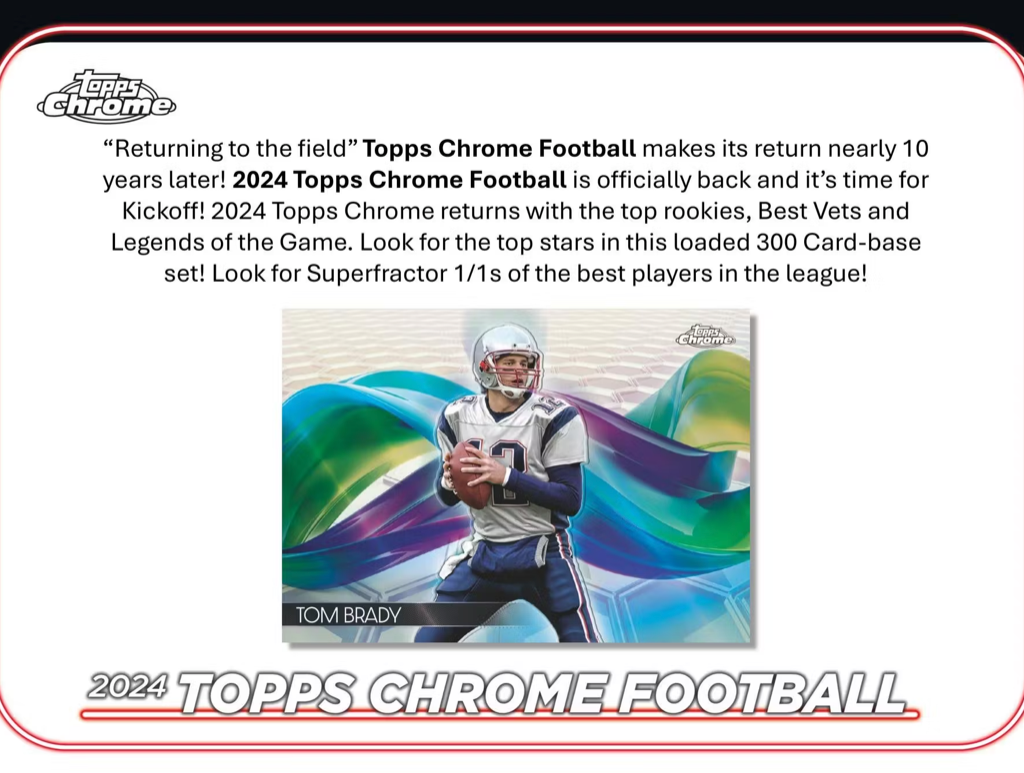 "Returning to the field" Topps Chrome Football makes its return nearly 10 years later! 2024 Topps Chrome Football is officially back and it's time for Kickoff!