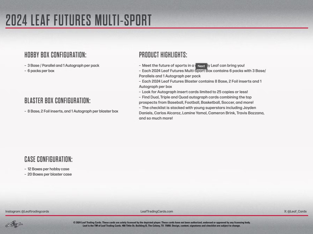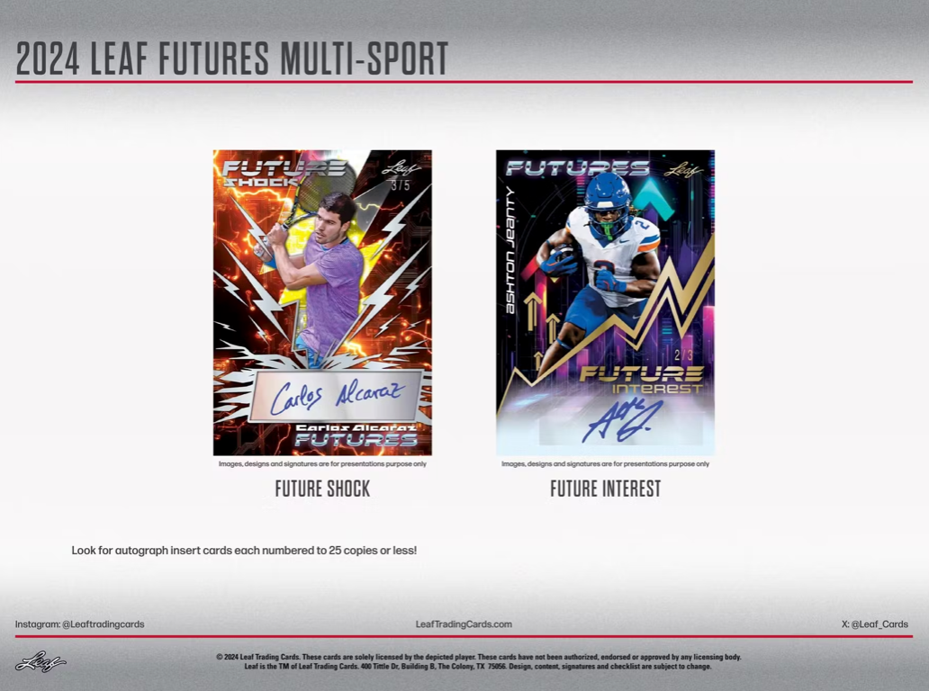 Each 2024 Leaf Futures Multi-Sport Box contains 6 packs with 3 Base/ Parallels and 1 Autograph per pack Look for Autograph insert cards limited to 25 copies or less!