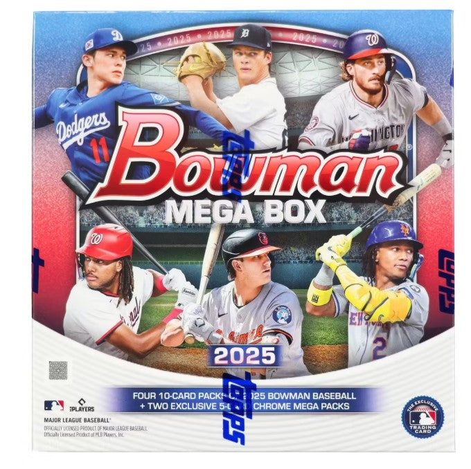 Look for four (4) 2025 Bowman Base packs and two (2) exclusive Mega Chrome packs per Mega Box!