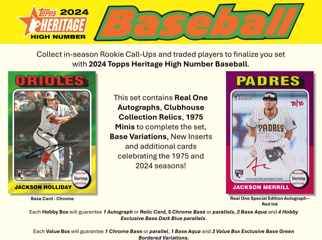 Collect in-season Rookie Call-Ups and traded players to finalize you set with 2024 Topps Heritage High Number Baseball.
