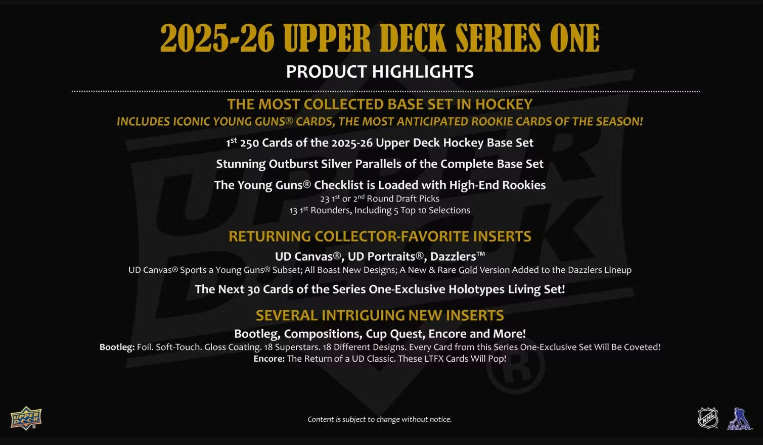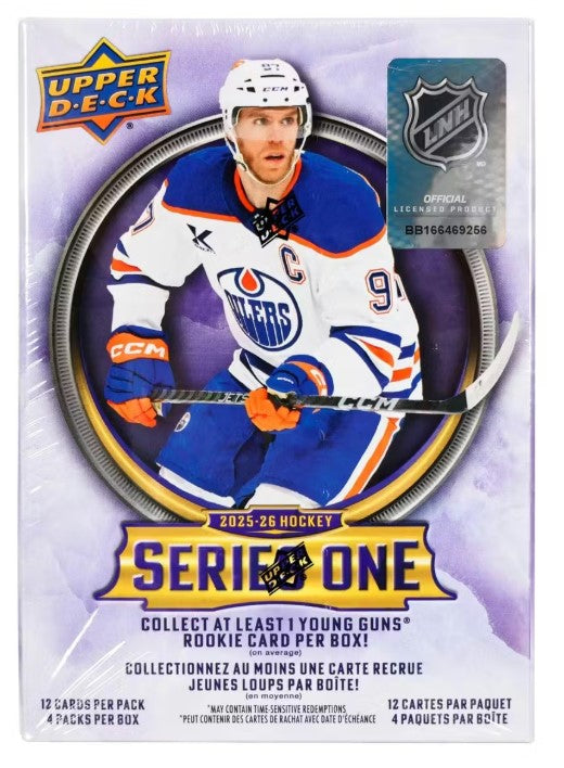 Series 1 sports the first 250 cards of the 2025-26 Upper Deck Base Set. It includes 198 veteran cards, 49 Young Guns cards and three checklist cards. The iconic Young Guns are the most anticipated rookie cards of the season and the Series 1 checklist is loaded with high-end rookies!