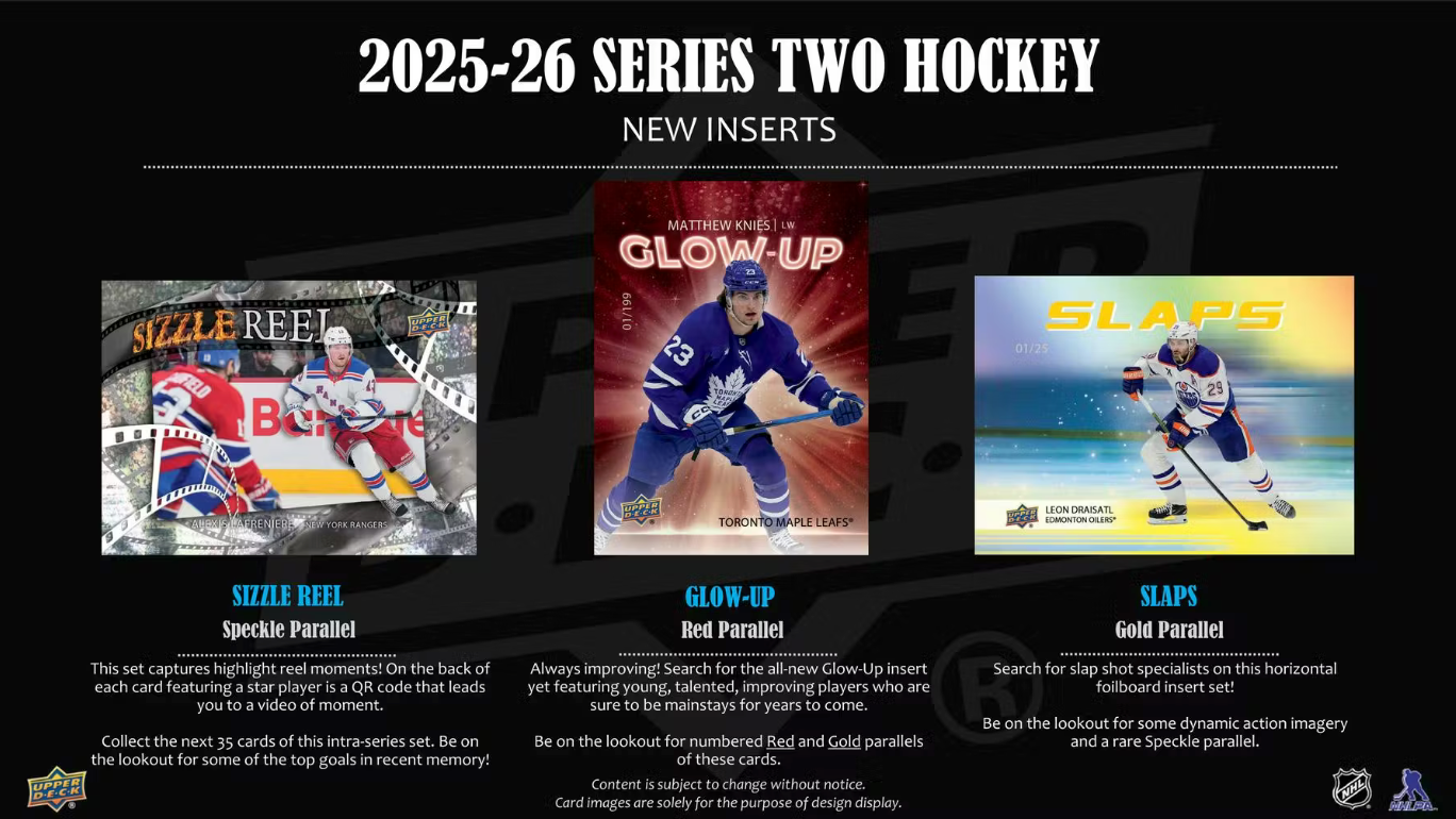Series 2 sports the next 250 cards of the 2025-26 Upper Deck Base Set. Annually, the Upper Deck Base Set is the most widely-collected Base Set in hockey. It includes 198 veteran cards, 49 Young Guns rookie cards and three checklist cards. The iconic Young Guns are the most anticipated rookie cards of the season.