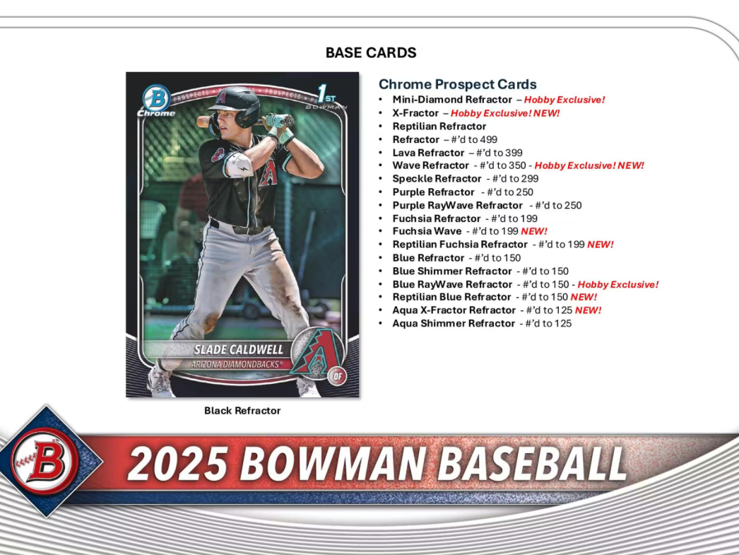 Look for 1st Bowman cards of Jesus Made, JJ Wetherholt, Quinn Mathews, Kevin McGonigle, Thomas White, Charlie Condon, Eduardo Quintero, Slade Caldwell, Brody Hopkins, George Klassen, D'Angelo Ortiz, Franklin Arias, and Rafael Flores!