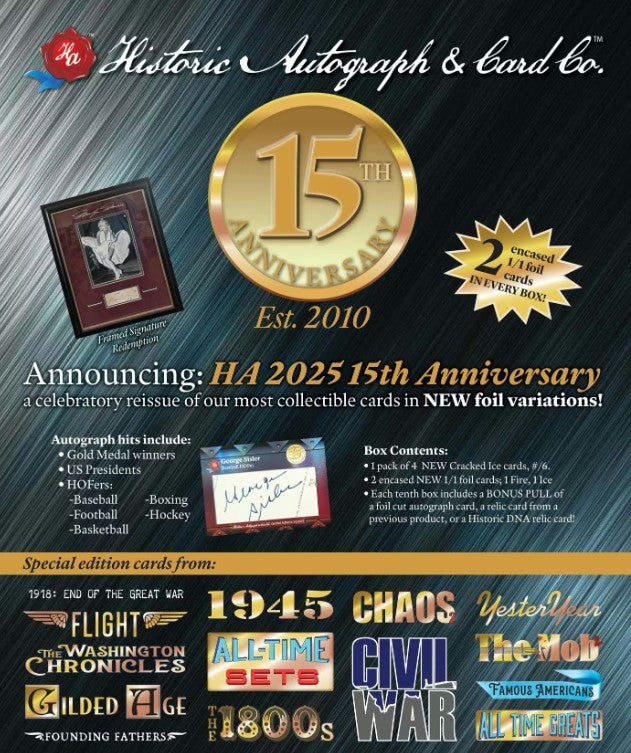 Celebrating 15 years of bringing wonderful collectibles and trading cards to a new genre, Historic Autographs has created a special edition of #1/1 foil-enhanced cards chronicling our products over the past decade. Each box will contain (2) #1/1 foil-enhanced cards with each card encased and sealed with a 15th Anniversary tamper-proof sticker. There is a "fire" and "ice" version for each card and both foil patterns. The boxes will also have a 4-card pack of cracked ice foil cards (all #/6).