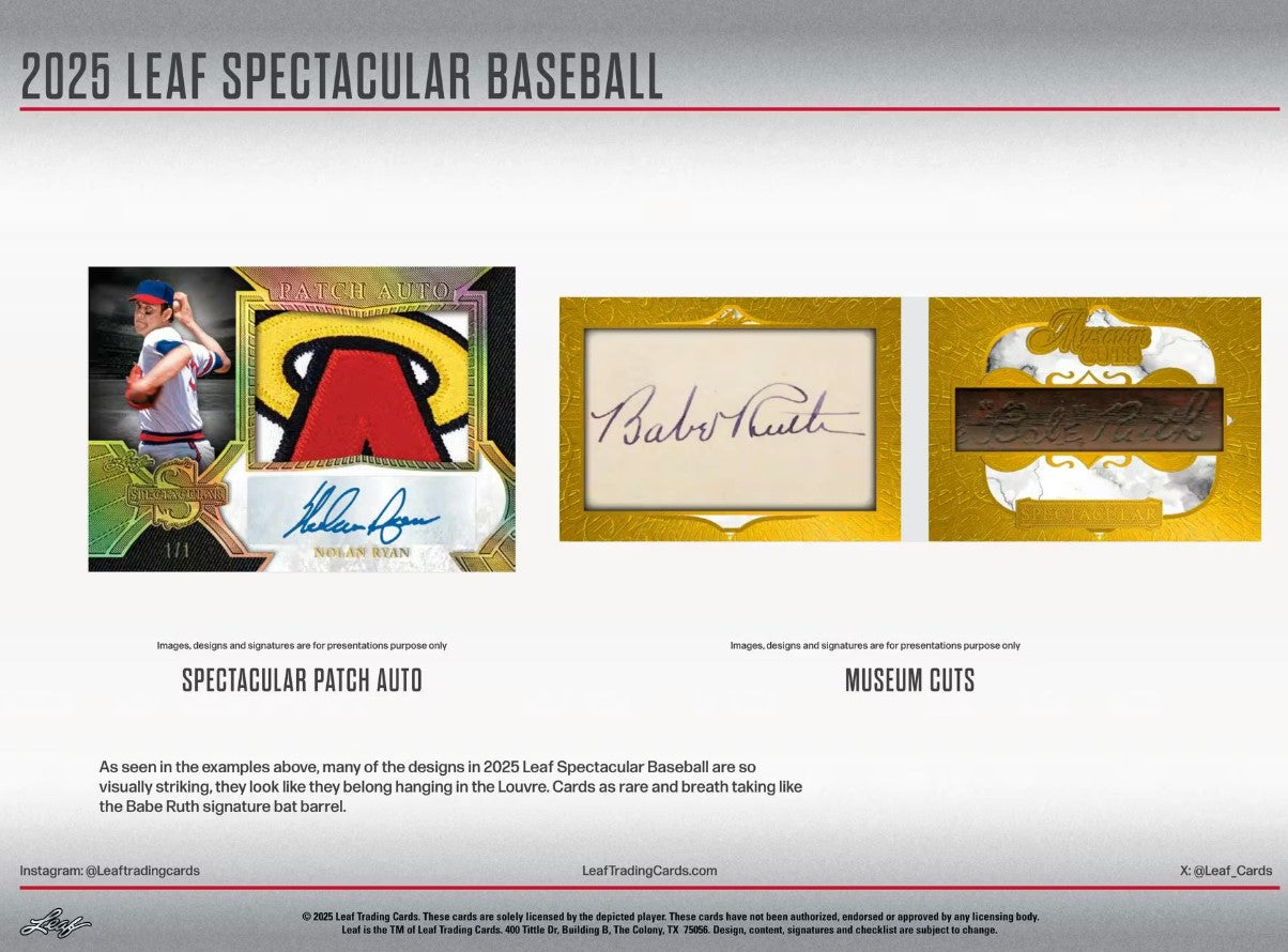 As seen in the examples above, many of the designs in 2025 Leaf Spectacular Baseball are so visually striking, they look like they belong hanging in the Louvre. Cards as rare and breath taking like the Babe Ruth signature bat barrel.
