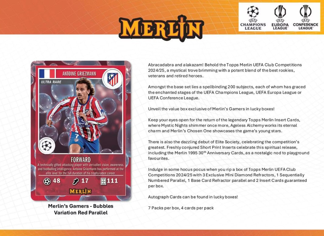 Indulge in some hocus pocus when you rip a box of Topps Merlin UEFA Club Competitions 2024/25 with 3 Exclusive Mini Diamond Refractors, 1 Sequentially Numbered Parallel, 1 Base Card Refractor parallel and 2 Insert Cards guaranteed per box.