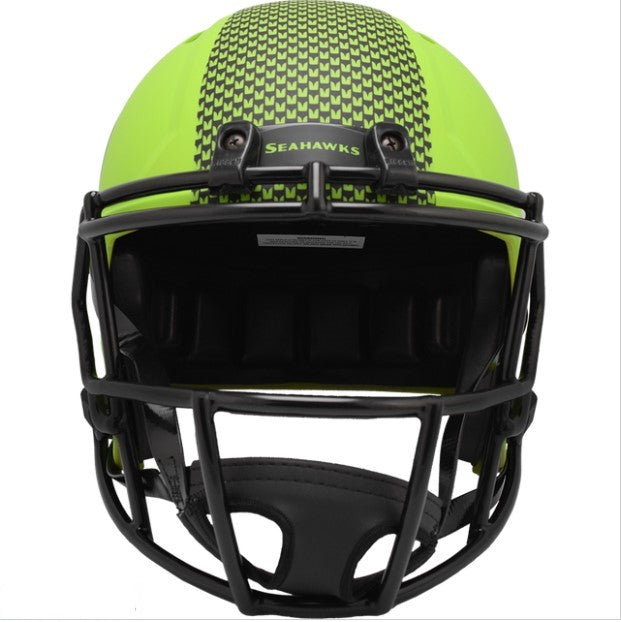 Based on one of the most popular on-field alternate designs, this collectible Speed Replica football helmet is made specifically for fans of the Seattle Seahawks. At approx. 9.5 in. tall, this replica size display helmet is perfect for all football fans and great for autographs. The helmet features a medium size Speed shell, the S2BD-SW-SP face mask, a 4-point chinstrap, and official paint and decals. The perfect collectible or gift!