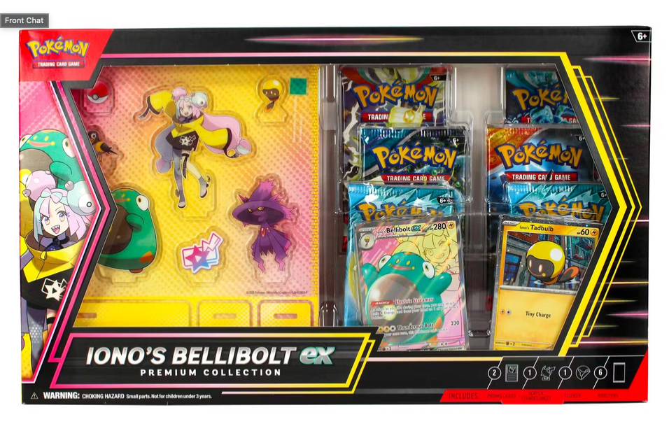 Levincia Gym Leader Iono and her partner Pokemon Bellibolt are an inseparable team full of supercharged spirit! With this collection, you can call on Iono's Bellibolt ex and its Electric Streamer Ability to energize the rest of Iono's Pokemon on your side. Then, get caught up in more electrifying fun with acrylic standees, a colorful photo sticker, and a handful of Pokemon TCG booster packs!