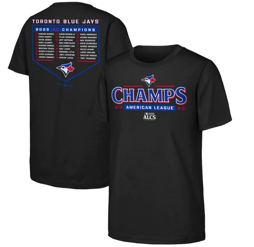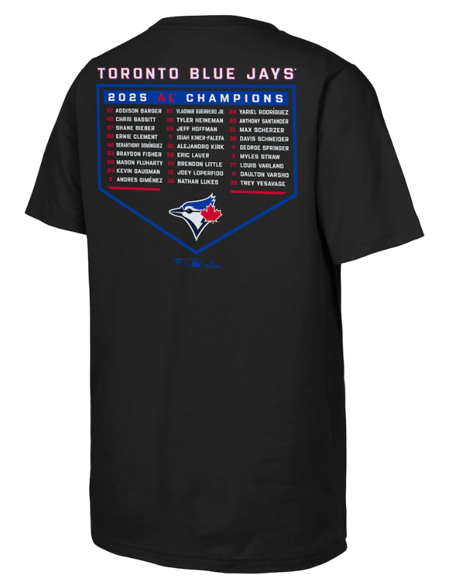 The Toronto Blue Jays are headed to the World Series! Capture all the excitement of their postseason run with this 2025 American League Champions Roster T-Shirt from Fanatics. Sporting graphics mirroring the team's victory attire, you'll be ready to root, root, root for the home team. Make sure you're geared up for the final stretch of the playoffs and ready to witness history.