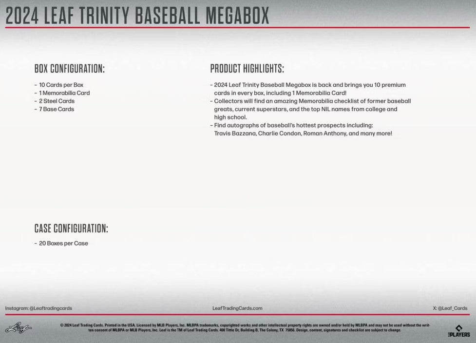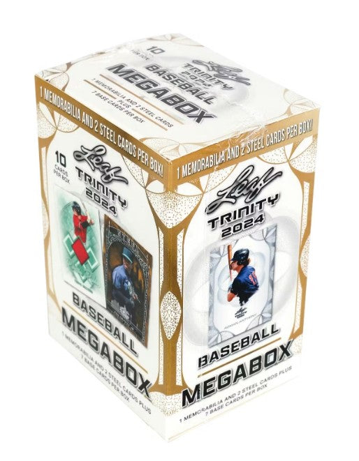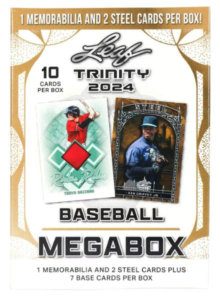 2024 Leaf Trinity Baseball Megabox is back and brings you 10 premium cards in every box, including 1 Memorabilia Card! The hobby's most popular baseball brand returns with amazing Rookie Relic, Trinity Base and Steel Base!