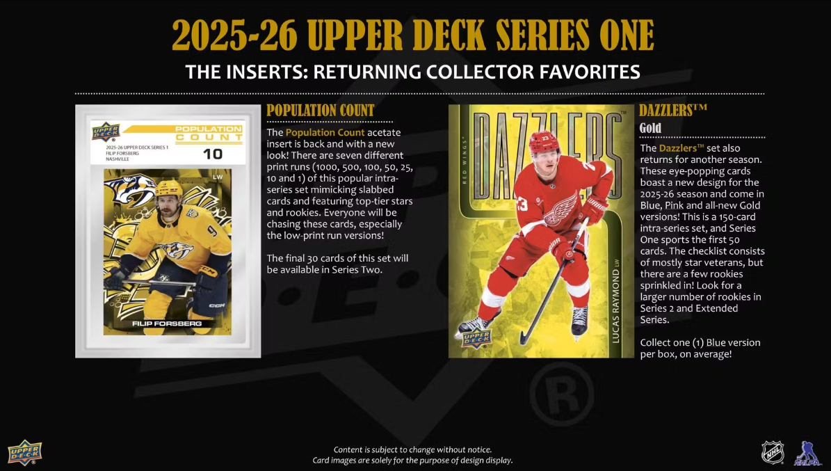 The Dazzlers set also returns for another season. These eye-popping cards boast a new design for the 2025-26 season and come in Blue, Pink and all-new Gold versions! This is a 150-card intra-series set, and Series 1 sports the first 50 cards. The checklist consists of mostly star veterans, but there are a few rookies sprinkled in! Look for a larger number of rookies in Series 2 and Extended Series. Collect one (1) Blue version per box, on average!