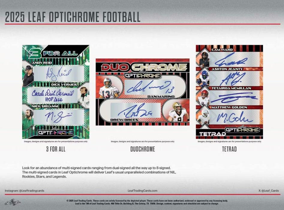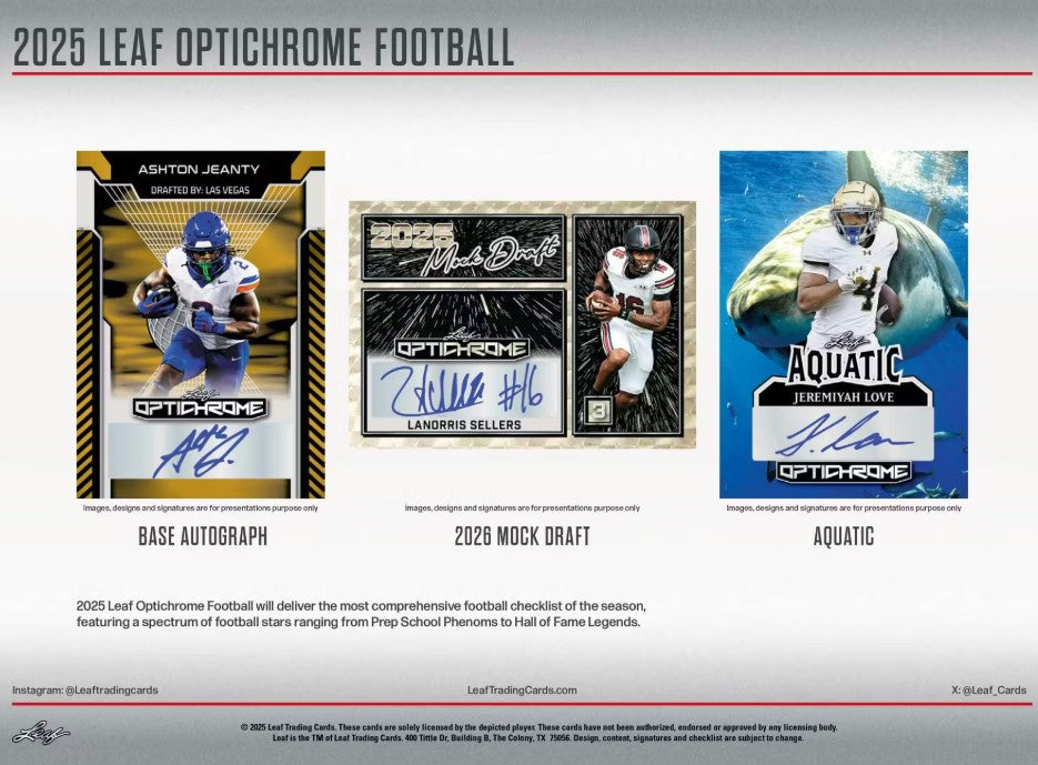2025 Leaf Optichrome Football will deliver the most comprehensive football checklist of the season, featuring a spectrum of football stars ranging from Prep School Phenoms to Hall of Fame Legends.