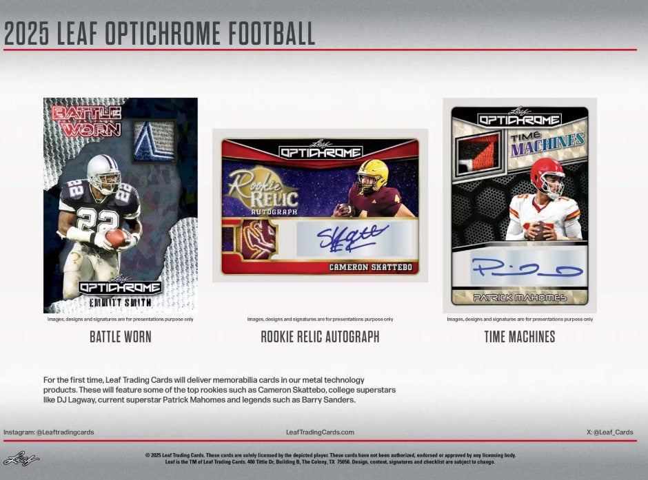 For the first time, Leaf Trading Cards will deliver memorabilia cards in our metal technology products. These will feature some of the top rookies such as Cameron Skattebo, college superstars like DJ Lagway, current superstar Patrick Mahomes and legends such as Barry Sanders.