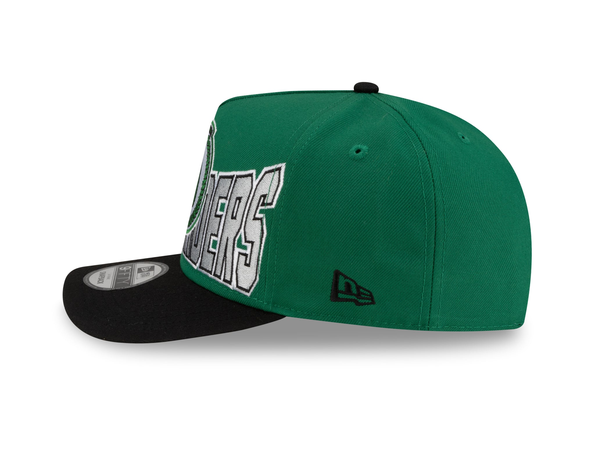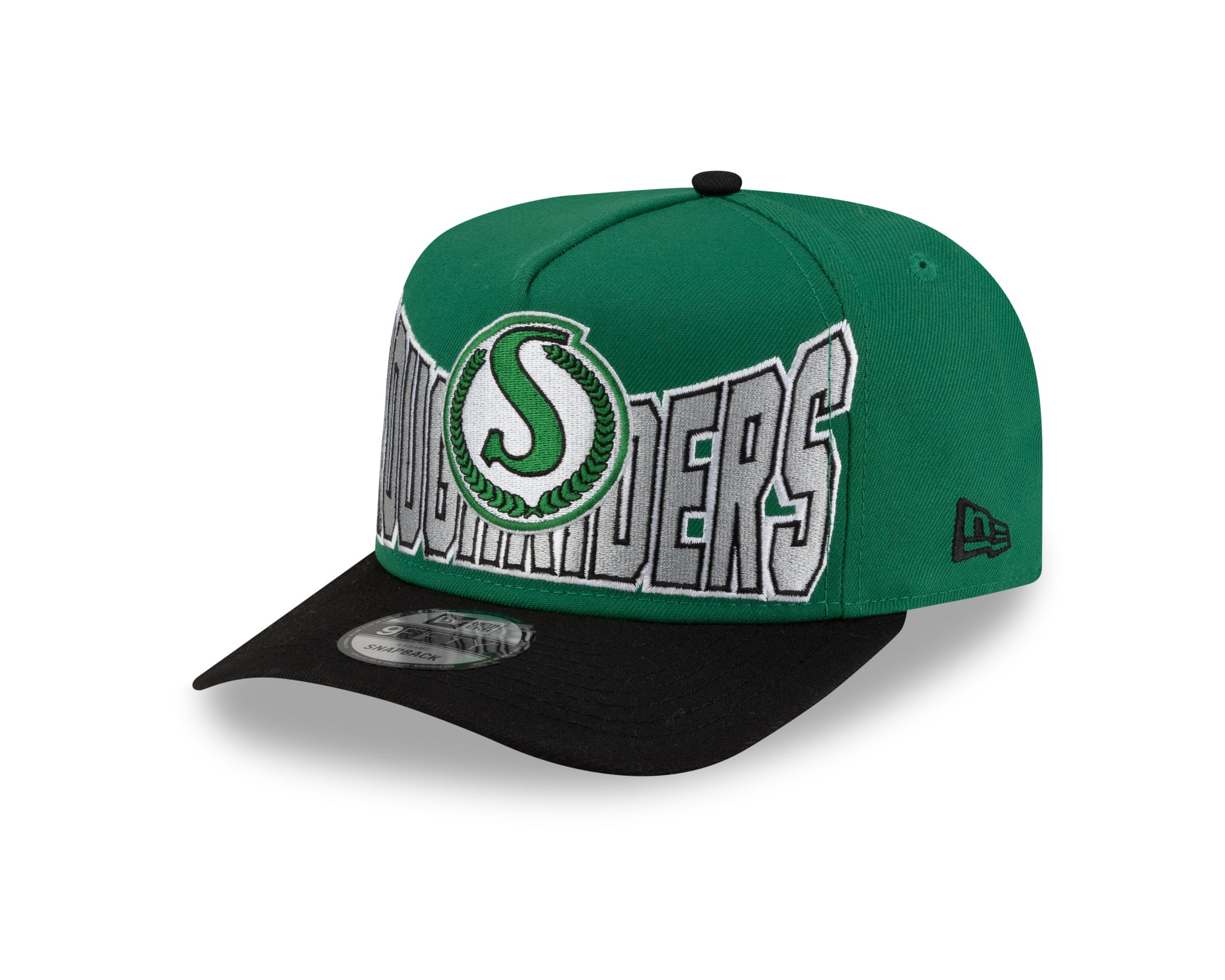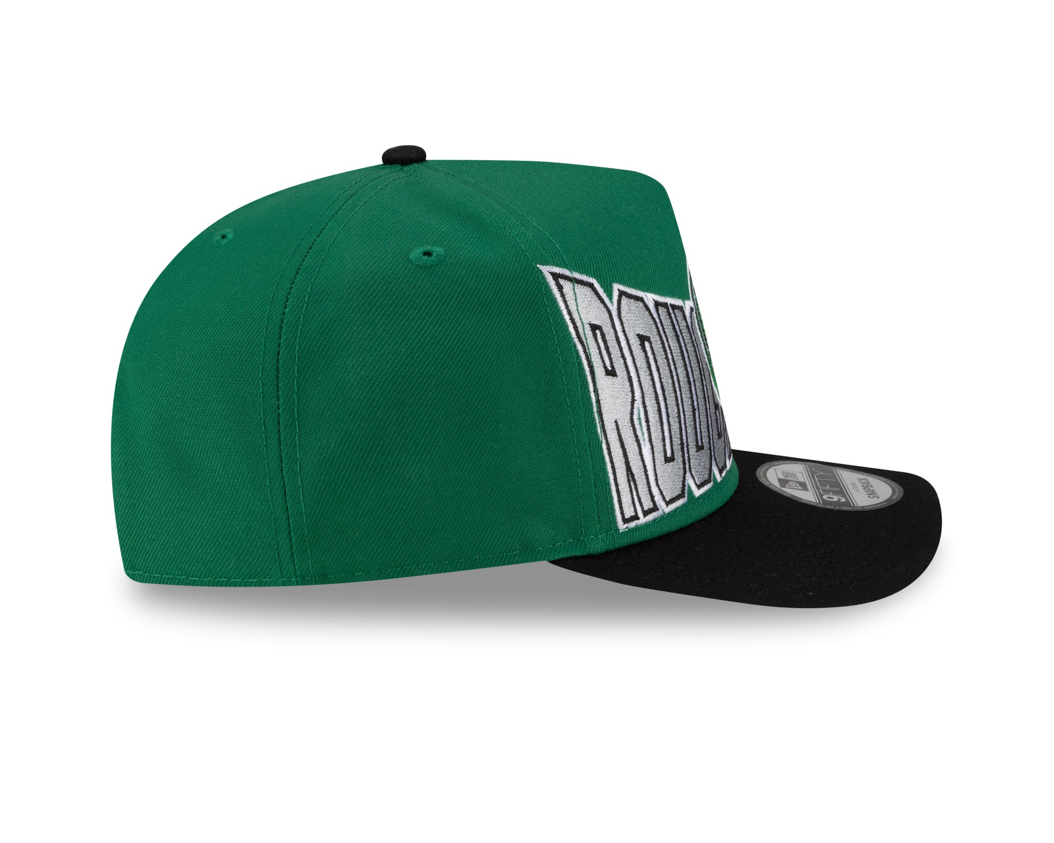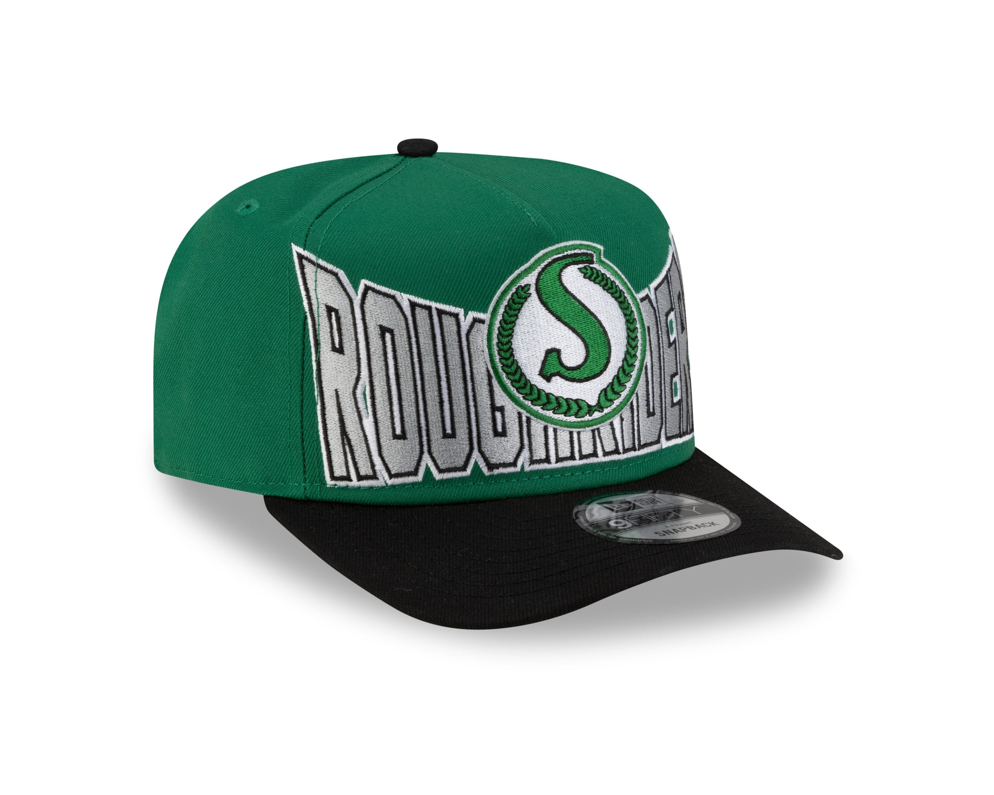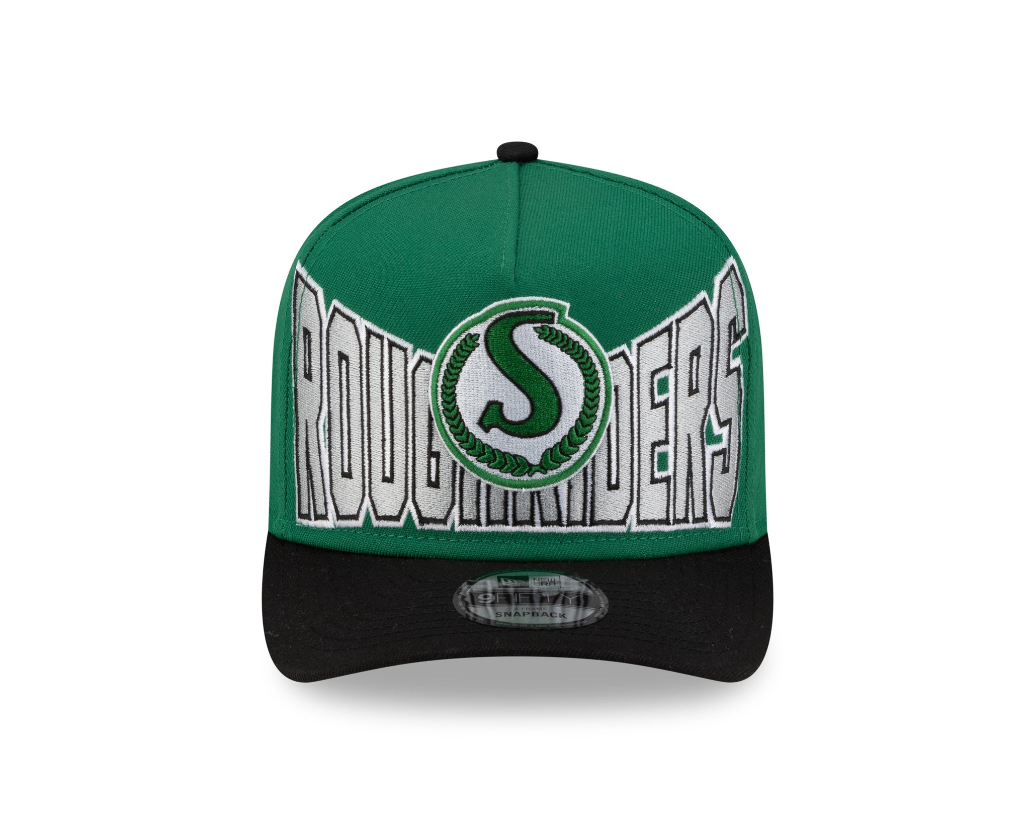 Men's New Era 9FIFTY CFL Saskatchewan Roughriders Big Block 2025 A-Frame Turf Traditions Sideline Two Tone Snapback Hat - Green/Black