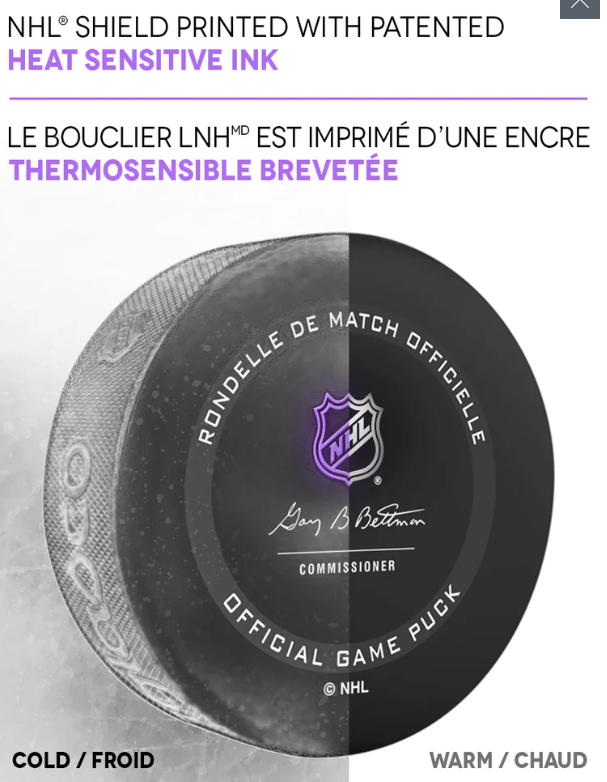 - Printed with patented heat sensitive ink that turns purple when frozen just like the actual puck used in every NHL Game